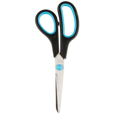 Ножницы офисные, длина 19см, лезвия с заточкой, черные, упакованы в ПВХ чехол с европодвесом. Предназначены для резки бумаги и картона.