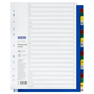 - Разделитель листов 20 листов, А4 OfficeSpace , алфавитный А-Я, цветной, пластиковый