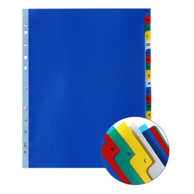 - Разделитель листов 20 листов А4, Office-2000, алфавитные А-Я,цветные, пластик 140 мкм