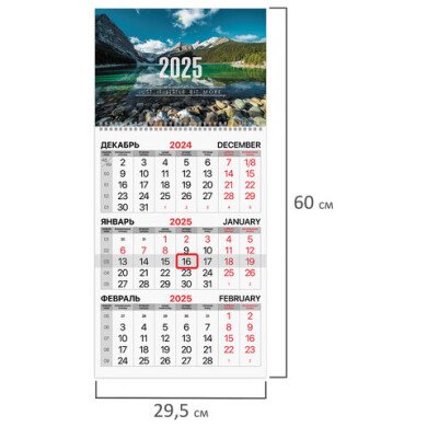 - Календарь квартальный на 2025 г. 1 блок, 1 гребень, с бегунком, офсет, BRAUBERG, "Горное озеро"