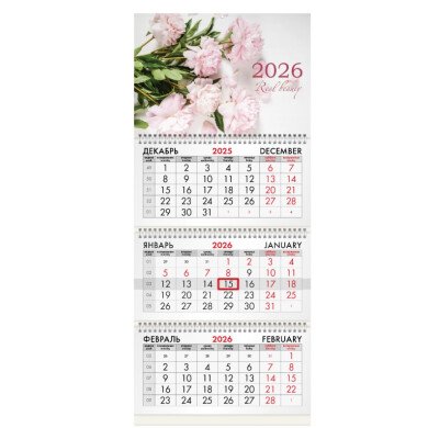 Календарь квартальный на 2026 г., 3 блока, 3 гребня, бегунок, офсет, BRAUBERG, "Пионы"