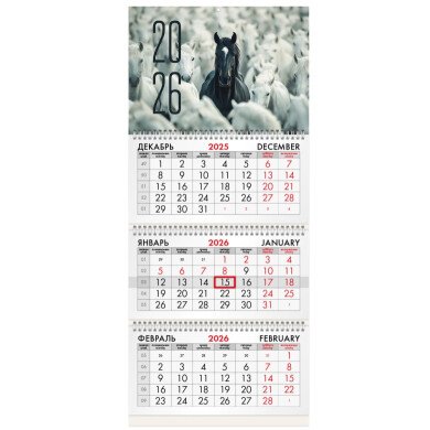 Календарь квартальный на 2026 г., 3 блока, 3 гребня, бегунок, мелованная бумага, BRAUBERG, "Лошадь"