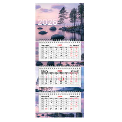 Календарь квартальный на 2026 г., 3 блока, 3 гребня, бегунок, мелован. бумага, BRAUBERG , "Озеро"