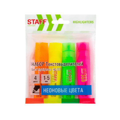 Набор текстовыделителей 4 НЕОН. ЦВЕТА, STAFF "EVERYDAY HL-707", линия 1-5 мм, скошен. наконечник