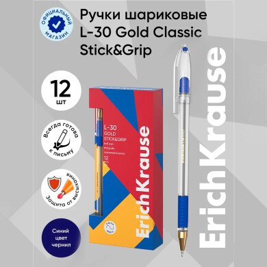 - Ручка шариковая 0,7 мм ErichKrause L-30, Gold Stick&Grip Classic, игольчатый узел , синяя
