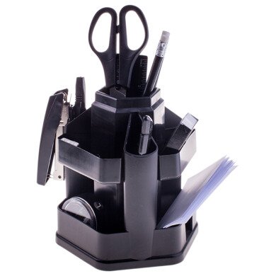 Прочный и надёжный настольный органайзер OfficeSpace "Офисный" имеет 13 предметов в наборе. Он идеально будет смотреться на рабочем столе и будет надёжным помощником для офисного работника. Изделие выполнено из прочного высококачественного пластика, что гарантирует надёжность и безопасность. Набор "Офисный" вращается и имеет 10 отделений под разные канцелярские предметы. Изделие упаковано в картонную коробку, в которую аккуратно вложены все предметы набора.