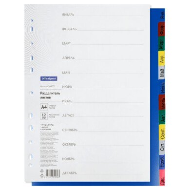 Разделитель листов 12 листов, А4, OfficeSpace Январь-Декабрь, цветной, пластиковый