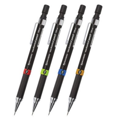 Механический карандаш с нажимным механизмом и грипом с насечкой "Diamond", которая предотвращает скольжение пальцев при использовании карандаша. Заправлен грифелем и имеет высококачественный ластик.