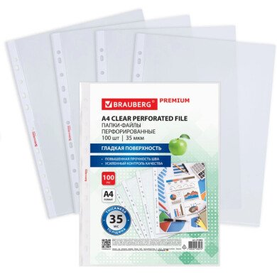 Файлы с перфорацией А4 35 мкм BRAUBERG "PREMIUM", пачка 100шт