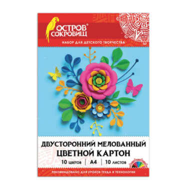 Картон цветной А4 10л 10цв. мелованный, 2-сторнний ОСТРОВ СОКРОВИЩ