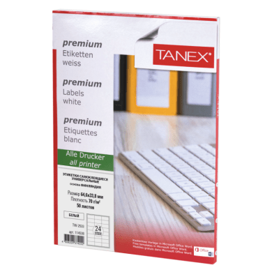 Этикетка самоклеящаяся 64,6х33,8 мм, 24 этикетки, белая 70 г/м2, 50 листов, TANEX, сырье Финляндия