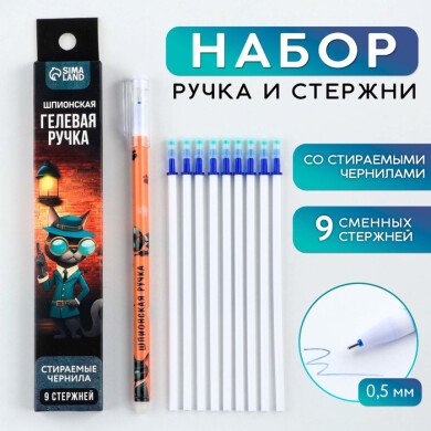 Ручка пиши стирай гелевая со стираемыми чернилами + 9шт стержней «Шпион», синяя паста, гелевая 0,5 м
